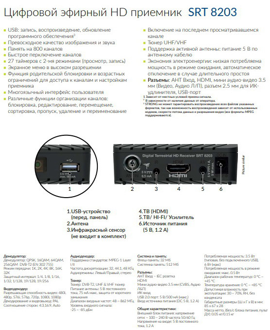 Компактний і продуктивнийSRT 8203, несмотря на небольшой размер, отлично подходит для приема открытых каналов в высоком разрешении. Простой в использовании, с удобным меню и функциями, что делает приемник надежным спутником в ваших домашних развлечениях. Встроенный USB-порт позволяет вам записывать телепрограммы и воспроизводить непосредственно с внешнего USB-устройства. Плюс многие другие функции, такие как: Телегид, таймеры, список избранного, телетекст, которые являются стандартными для приемника STRONG.